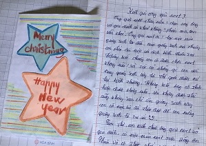 This year, I am 14 years old. Santa, how are you? Perhaps you are now reading letters from children from all parts of the country. I wish you a healthy merry Christmas and you welcome the Child Jesus with all your heart. I wish you a more peaceful, holy, and ever loving New Year with all. I wish you good health to continue being Santa Claus. I would like to have a small gift of a CASIO- 570 VN PLUS computer worth 460,000 VND I thank Santa Claus very much. Phan Quang Dog Xin chao Phan Quang Chien, How are you? Thank you very much for your letter. For your little gift I'm going to talk about it with Sister Rosa and then we have to wait for Christmas ;-) I hope you will have a nice party with all the friends at the Foyer. We too wish you a Merry Christmas and a Happy New Year! Lots of love, Ilona
